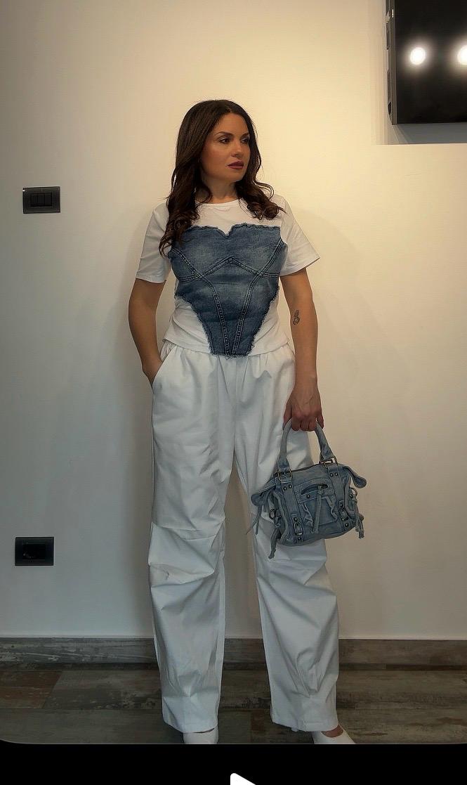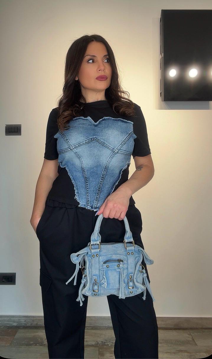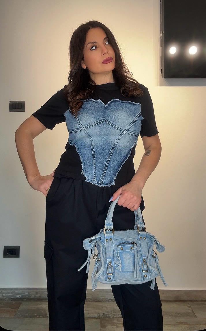 - Materiale: Realizzata in jeans, offre comfort e durabilità.