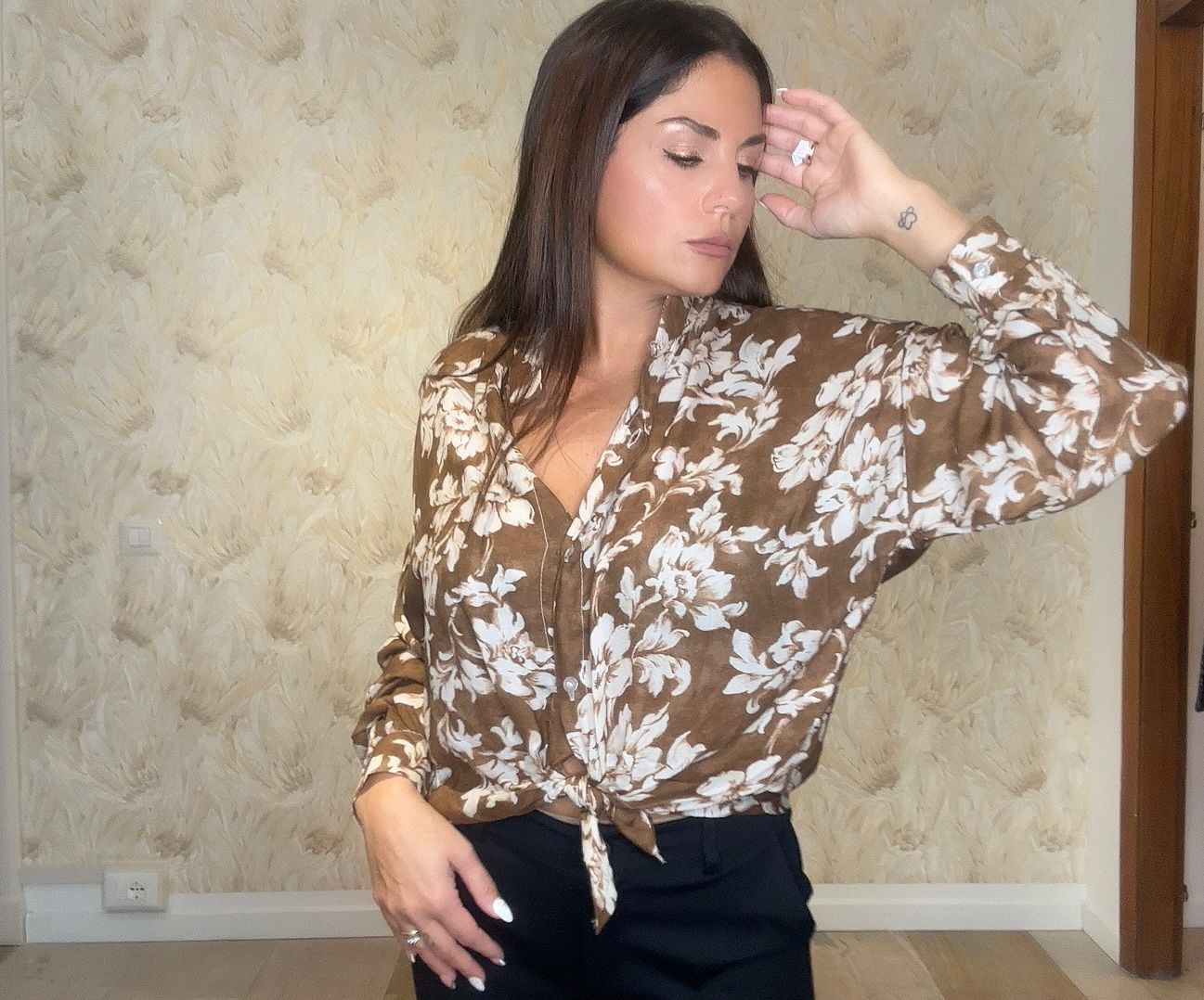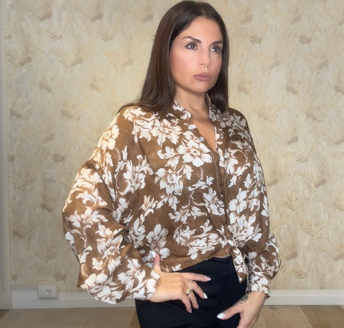 Camicia a fiori marrone e panna con bottoni e lacci in vita. Taglia unica