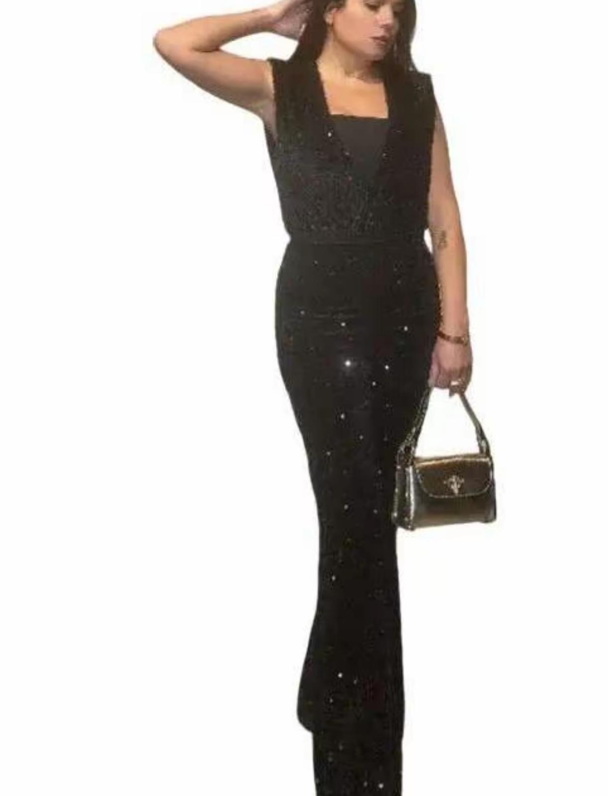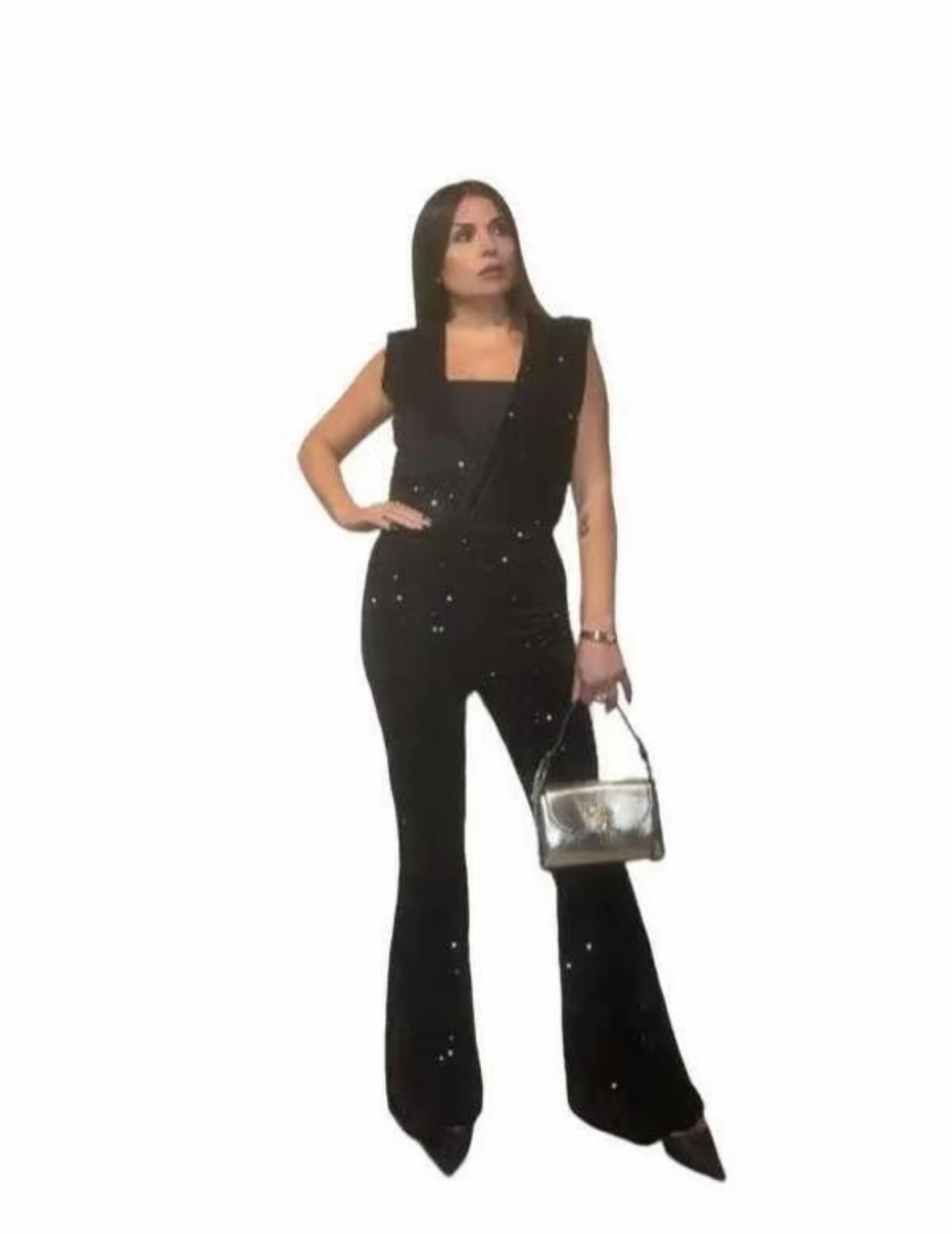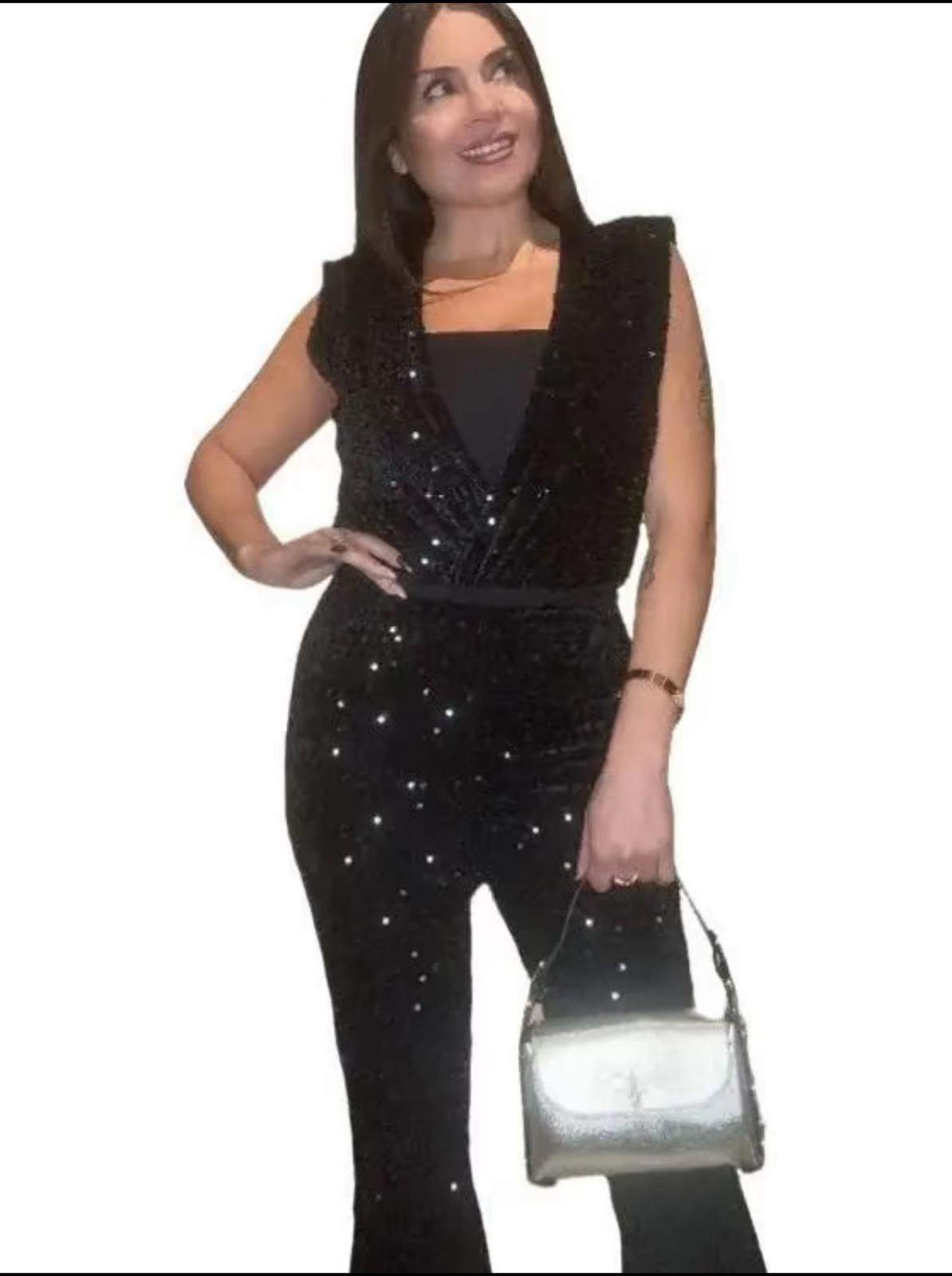 - Il pantalone a zampa e il body con paillettes aggiungono un tocco di stile.