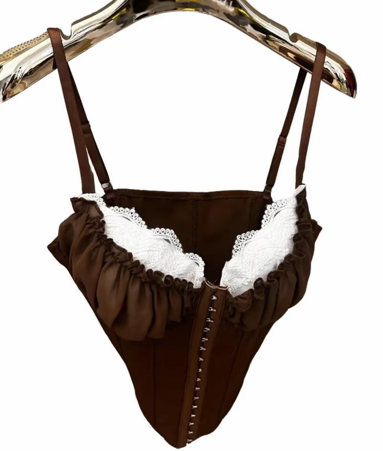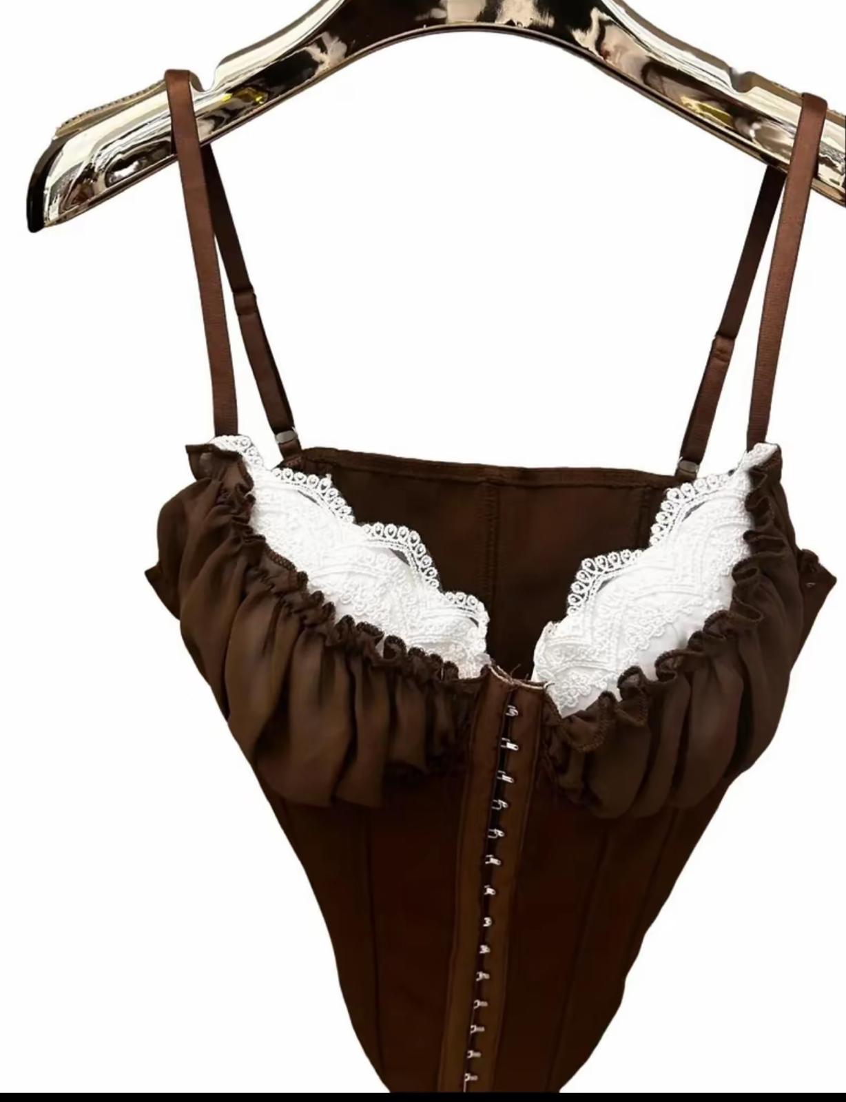 • 🌟 Design Elegante: Corpetto marrone con pizzo bianco, offrendo un look sofisticato. 🌟