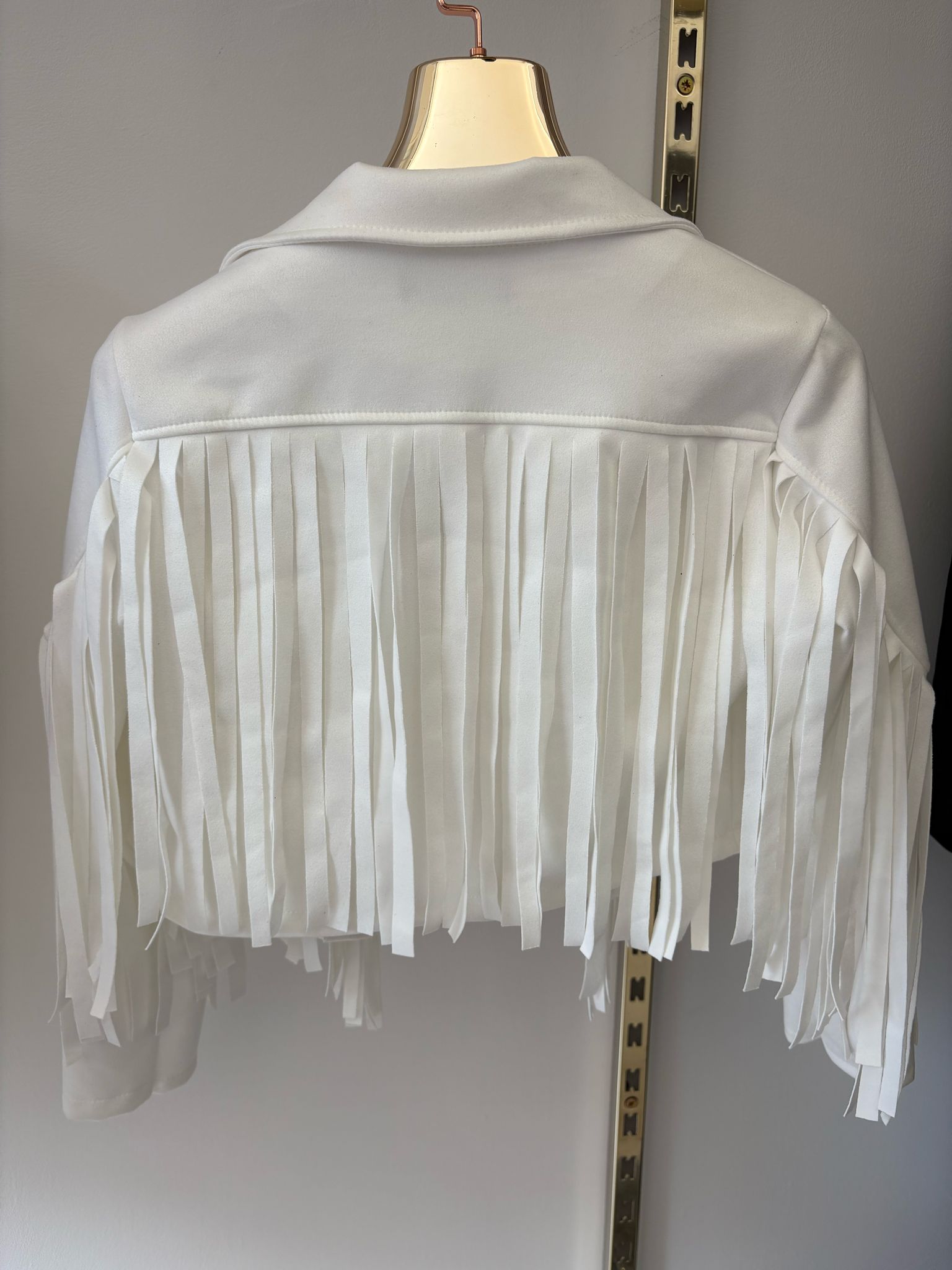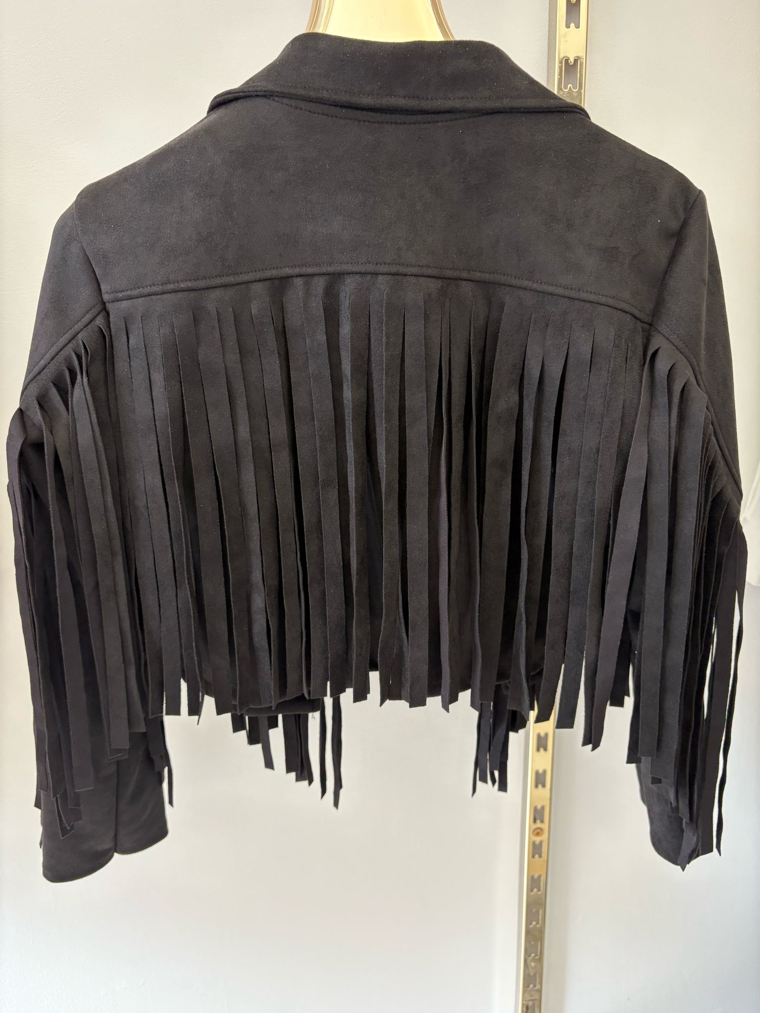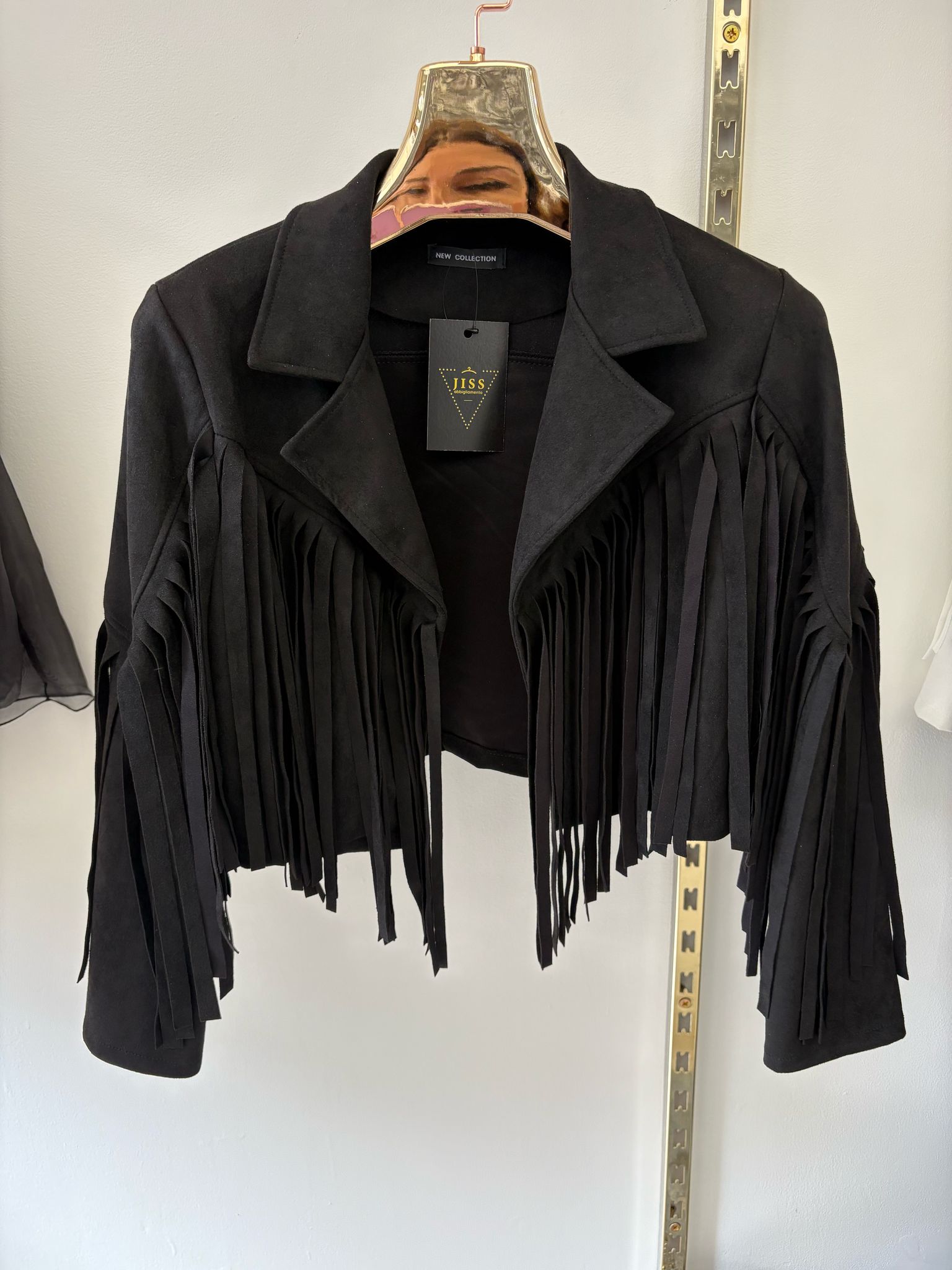 Giacca realizzata in tessuto effetto camoscio, dettaglio di frange dello stesso tessuto. Senza bottoni. Disponibile in 2 colori.