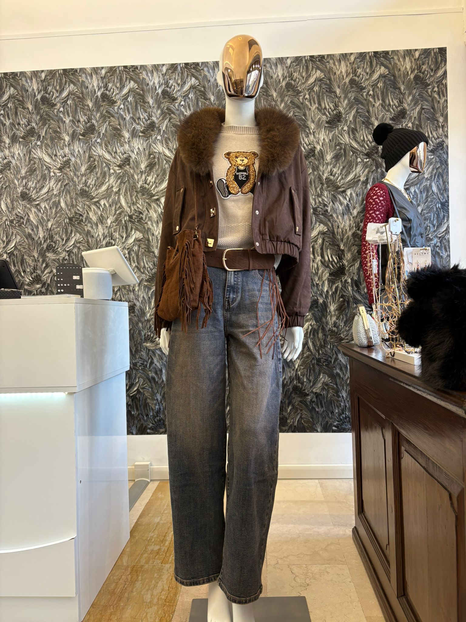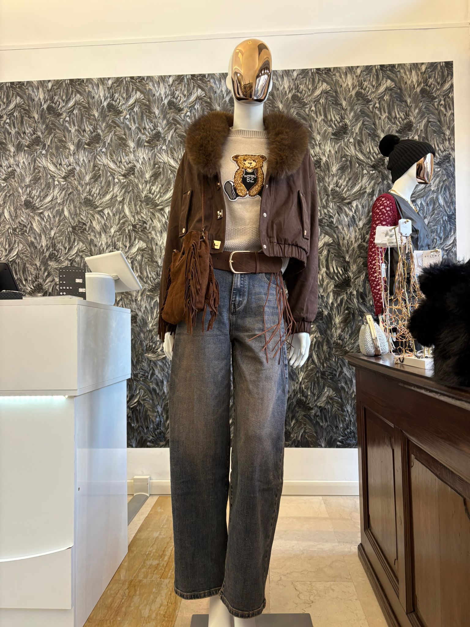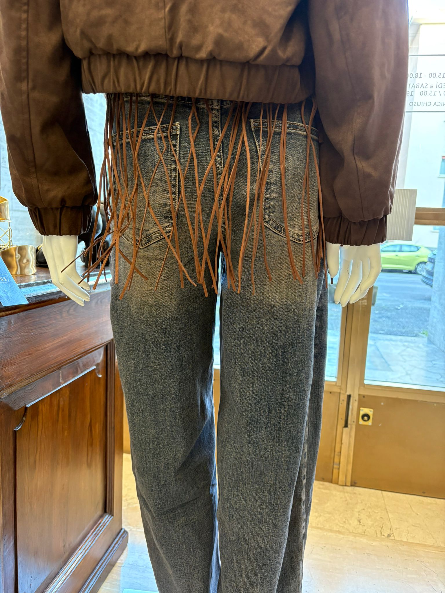 • Materiale: Jeans con cintura e frange.