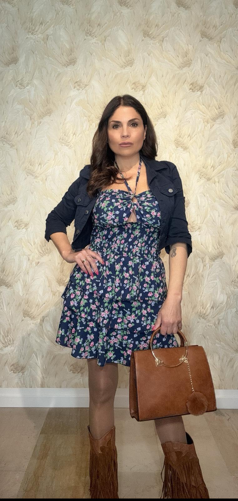 Minidress blu stampa a fiori con volant e coppa preformata, Taglia unica