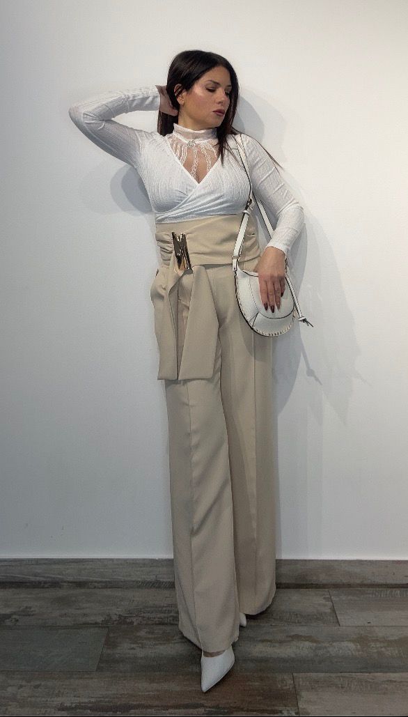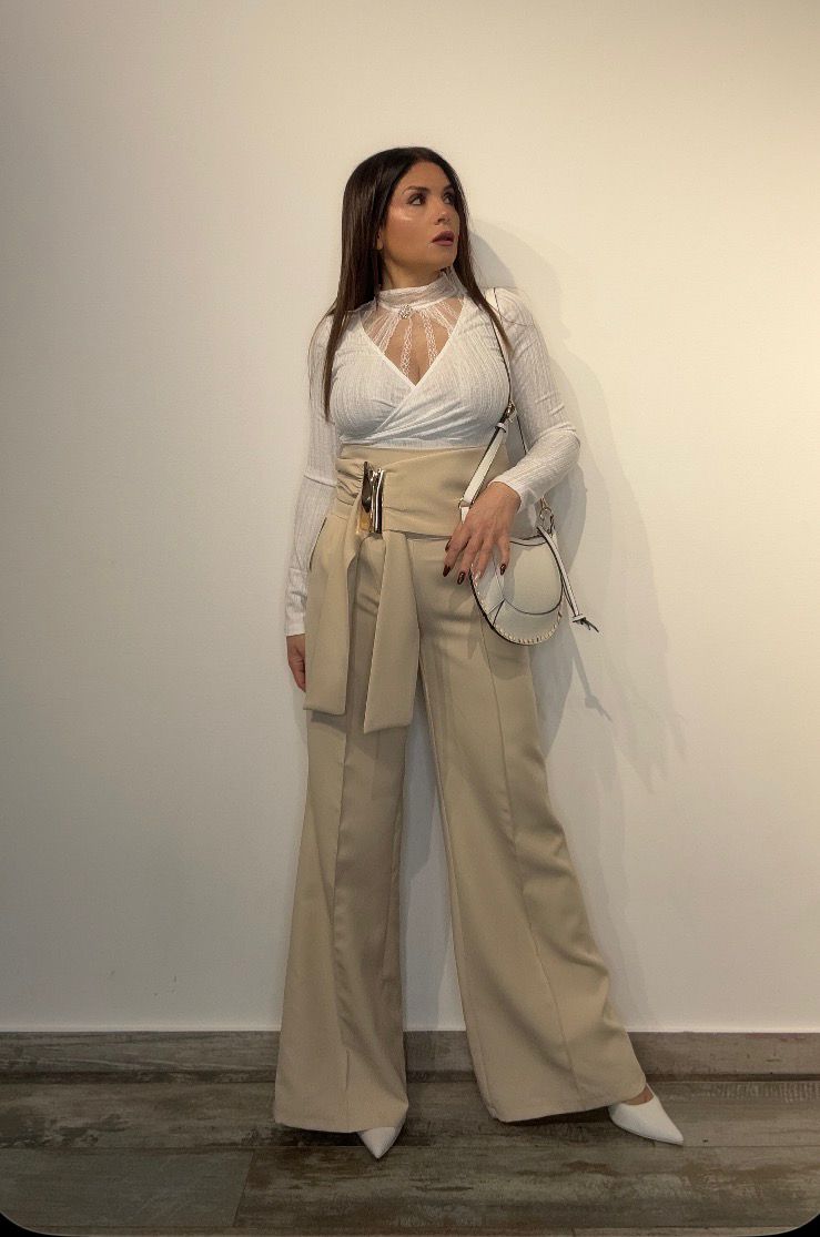 ✨ Presentiamo il Pantalone Palazzo Vita Altissima, un capo che combina eleganza e modernità. Questo pantalone è caratterizzato da una vita altissima e da una fascia laterale, che aggiunge un tocco di stile. Il dettaglio dorato conferisce un look raffinato. Perfetto per chi ama un abbigliamento sofisticato.