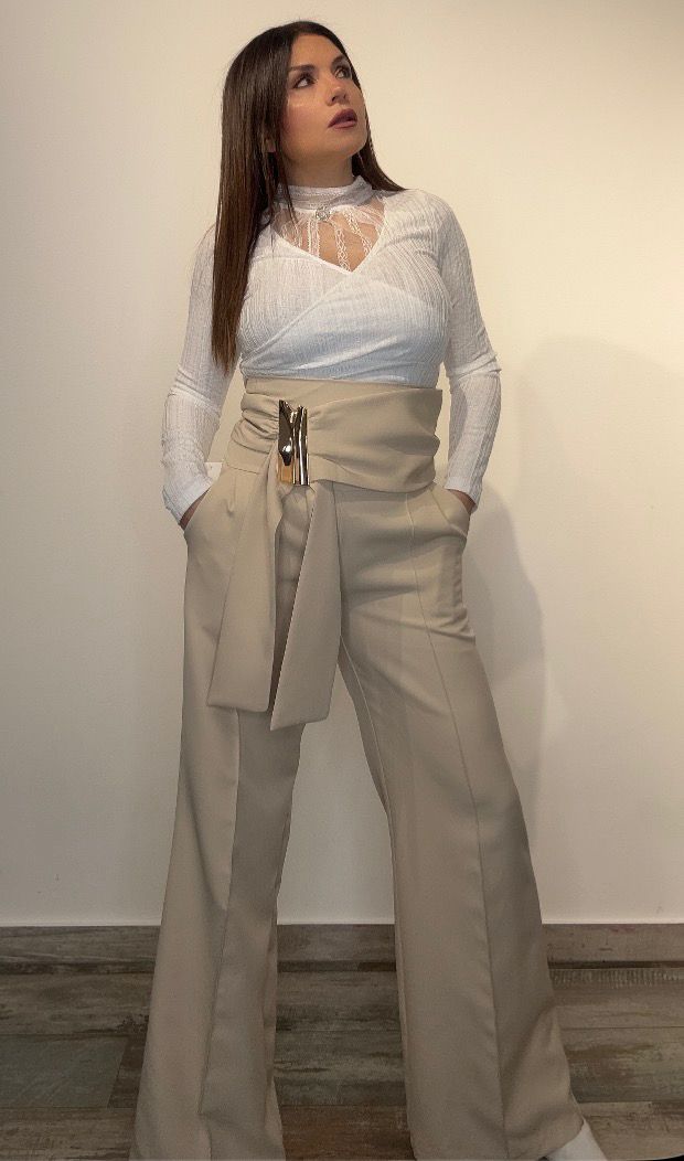 Questo pantalone è ideale per chi cerca un abbigliamento elegante e moderno. La vita altissima e il dettaglio dorato lo rendono un capo unico. Perfetto per eventi speciali.