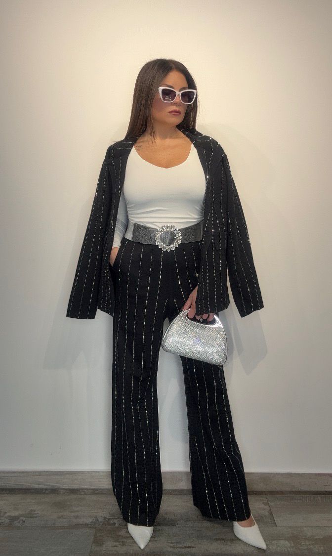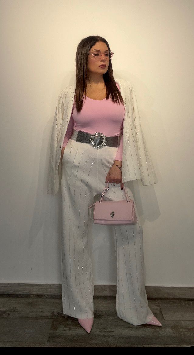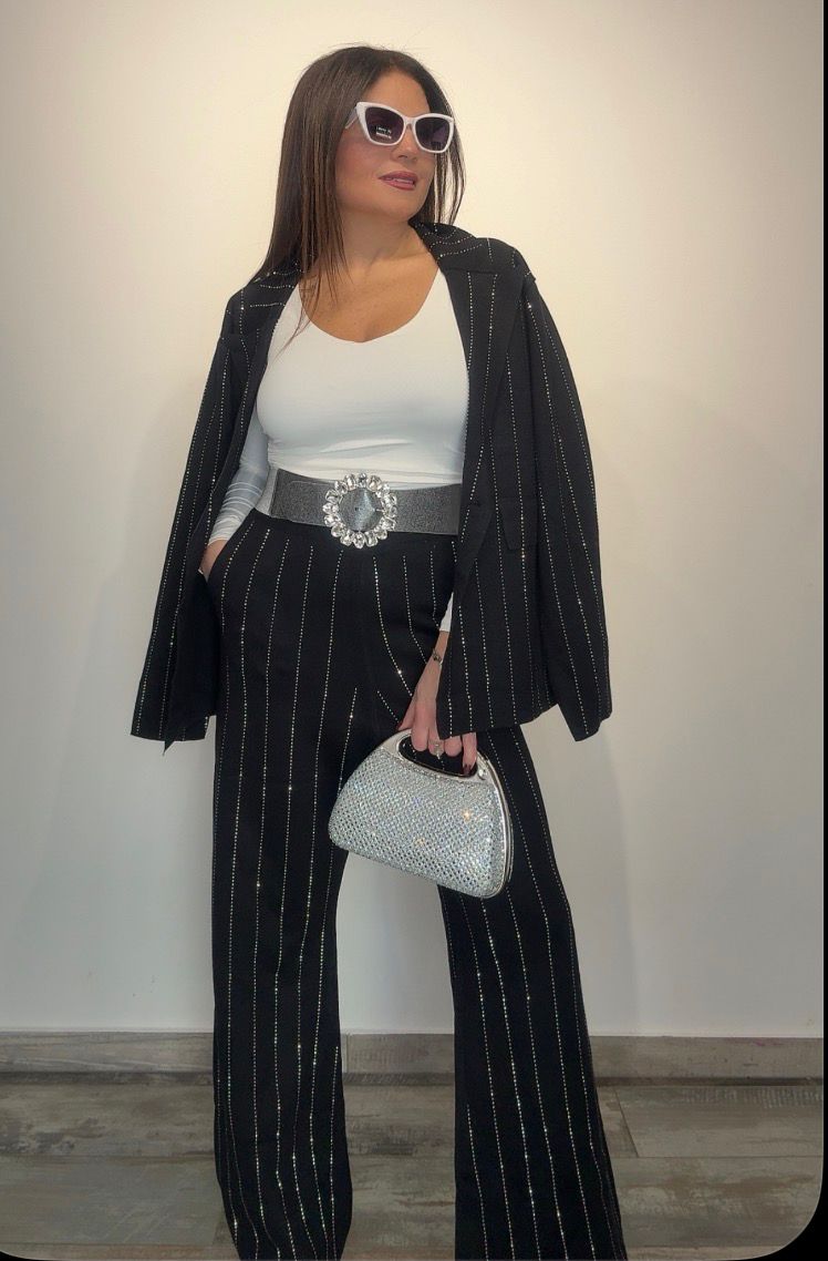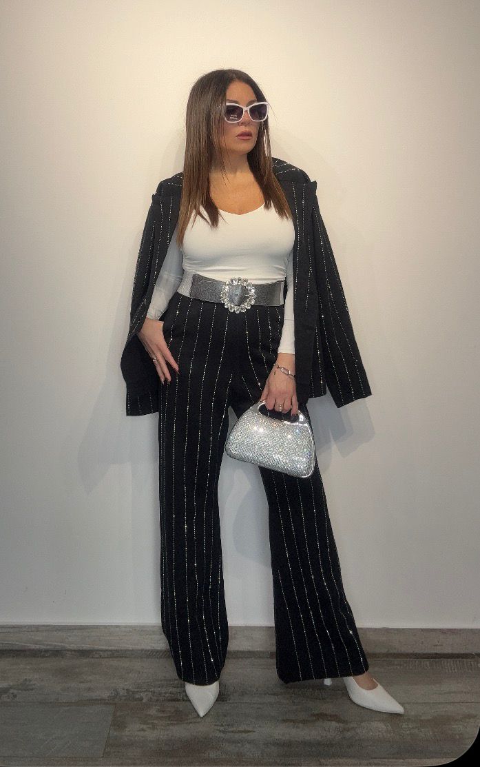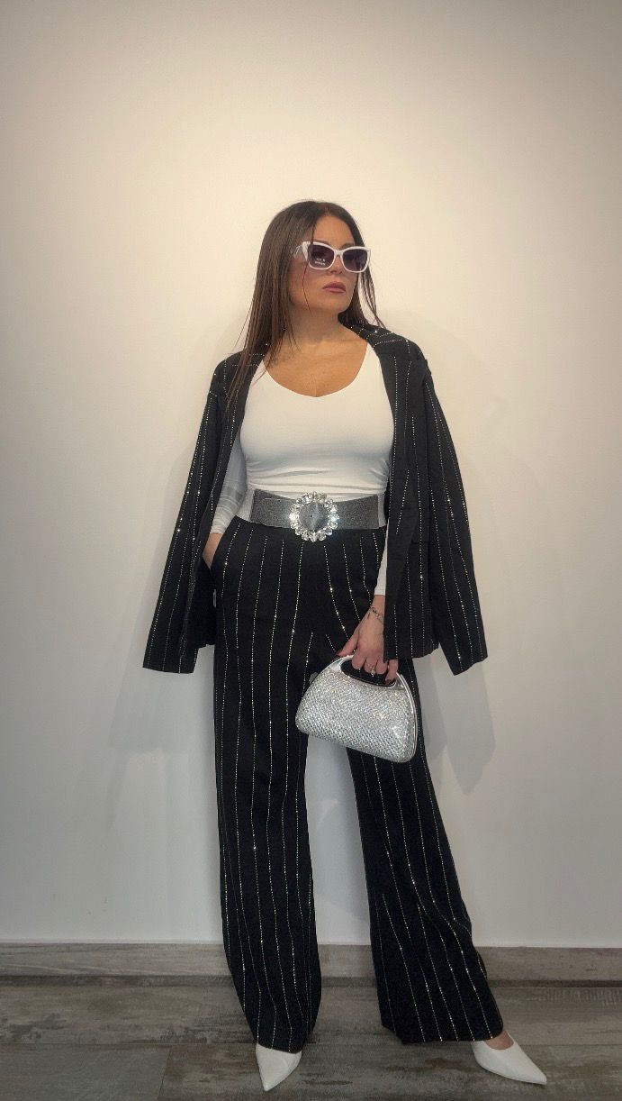 - Tailleur: In tessuto elasticizzato con brillantini. Perfetto per un look elegante e confortevole.